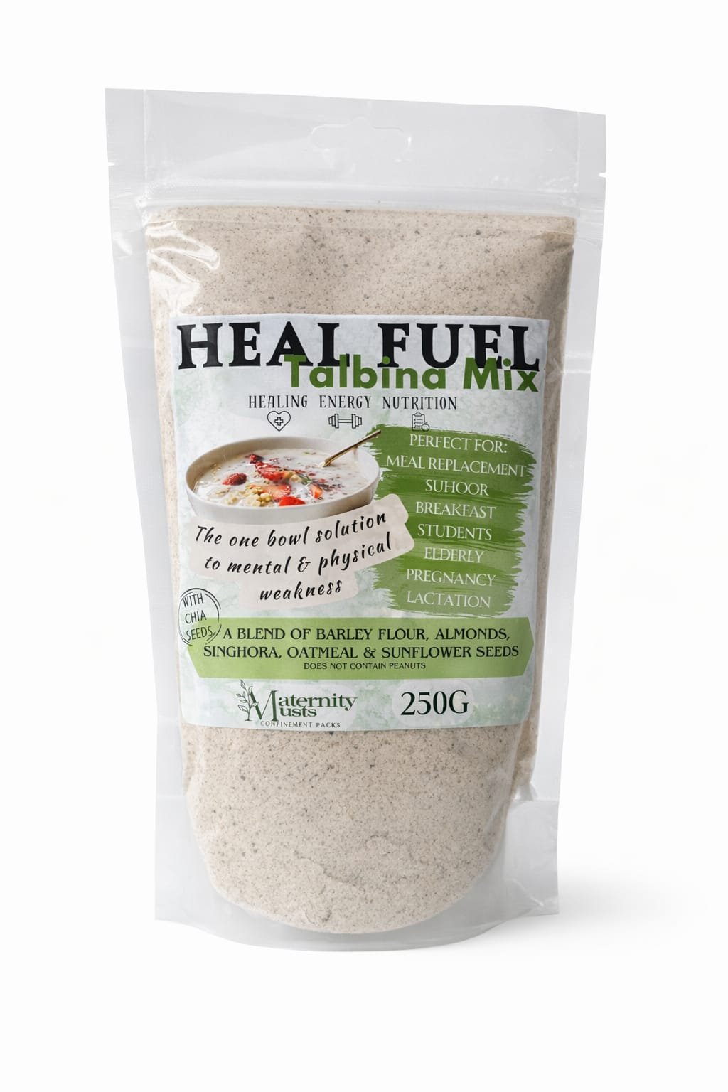 Heal Fuel Talbina is a nutrient-dense, high-fiber barley-based porridge mix designed to combat physical and mental fatigue, acting as a healthy meal replacement or snack. Primarily featuring Barley Flour (Talbina), this blend often includes almonds, sunflower seeds, chia seeds, and oatmeal. It is suitable for Suhoor/Ramadan, the elderly, students, and breastfeeding mothers